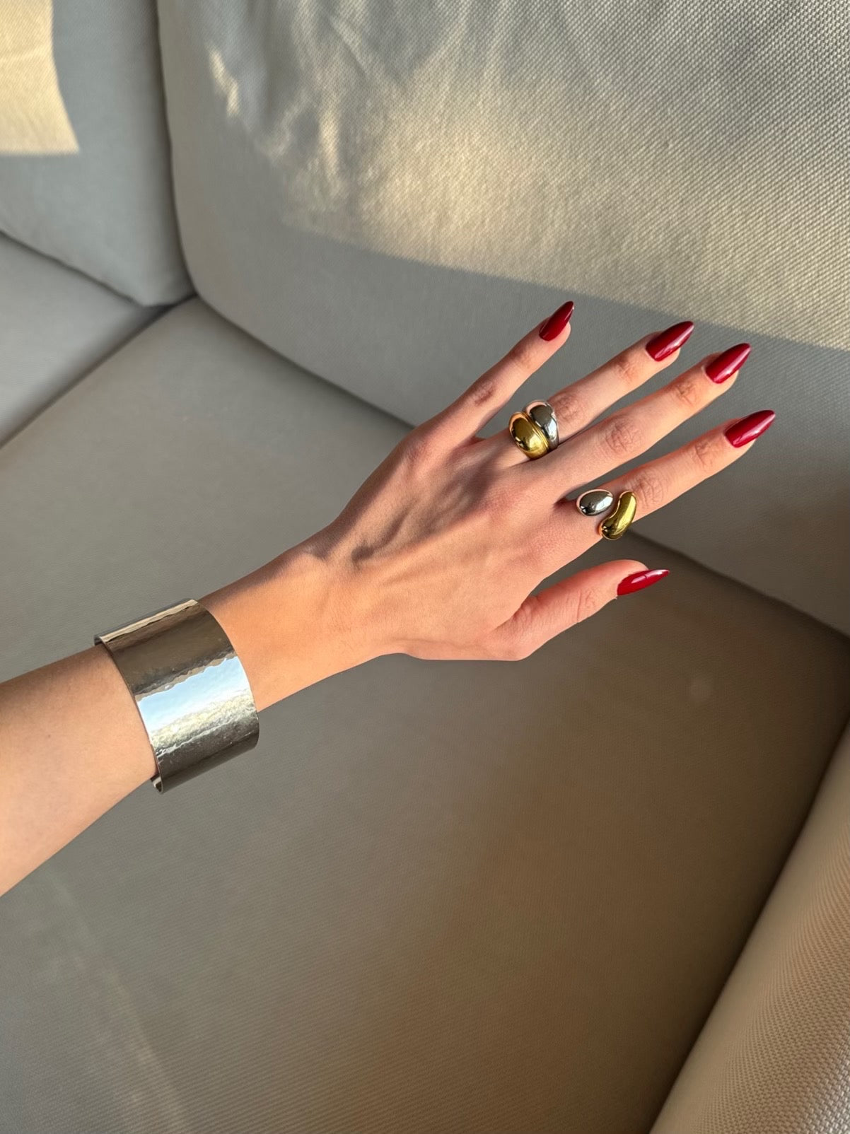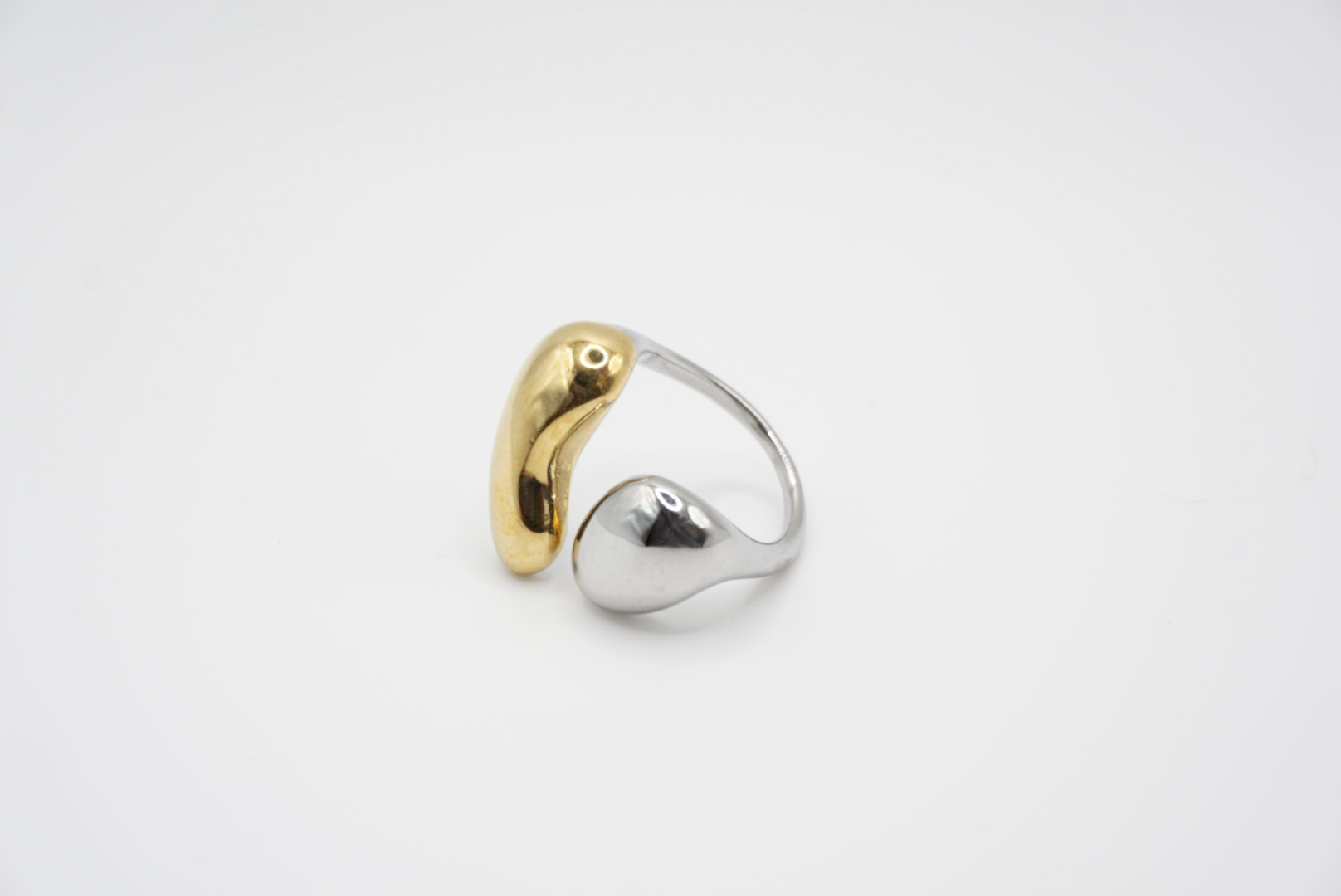 Découvrez Aya, une bague sculpturale unique, conçue en acier inoxydable durable et hypoallergénique. Avec son design organique et épuré, elle marie harmonieusement deux finitions : un éclat doré chaleureux et un argenté élégant.